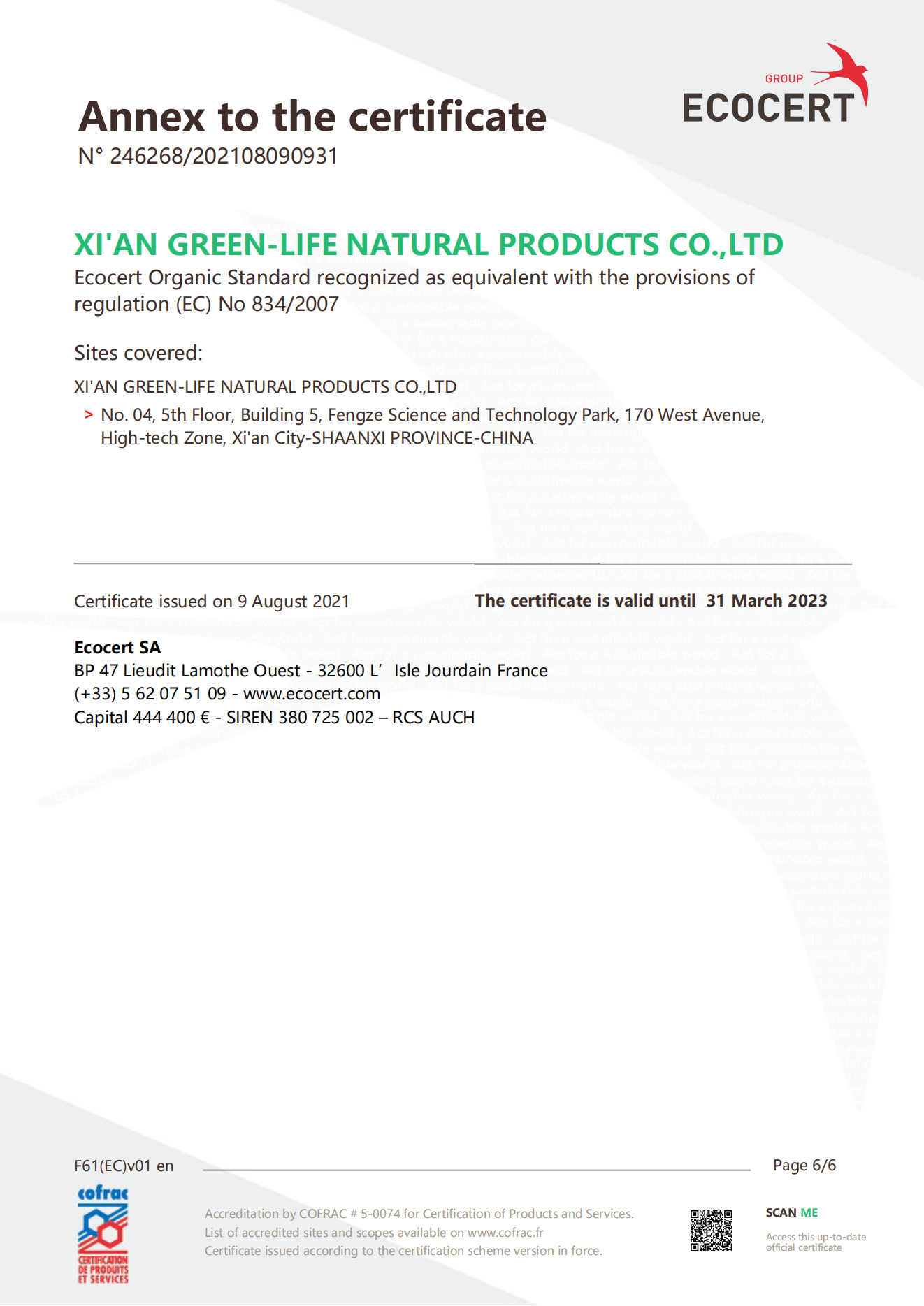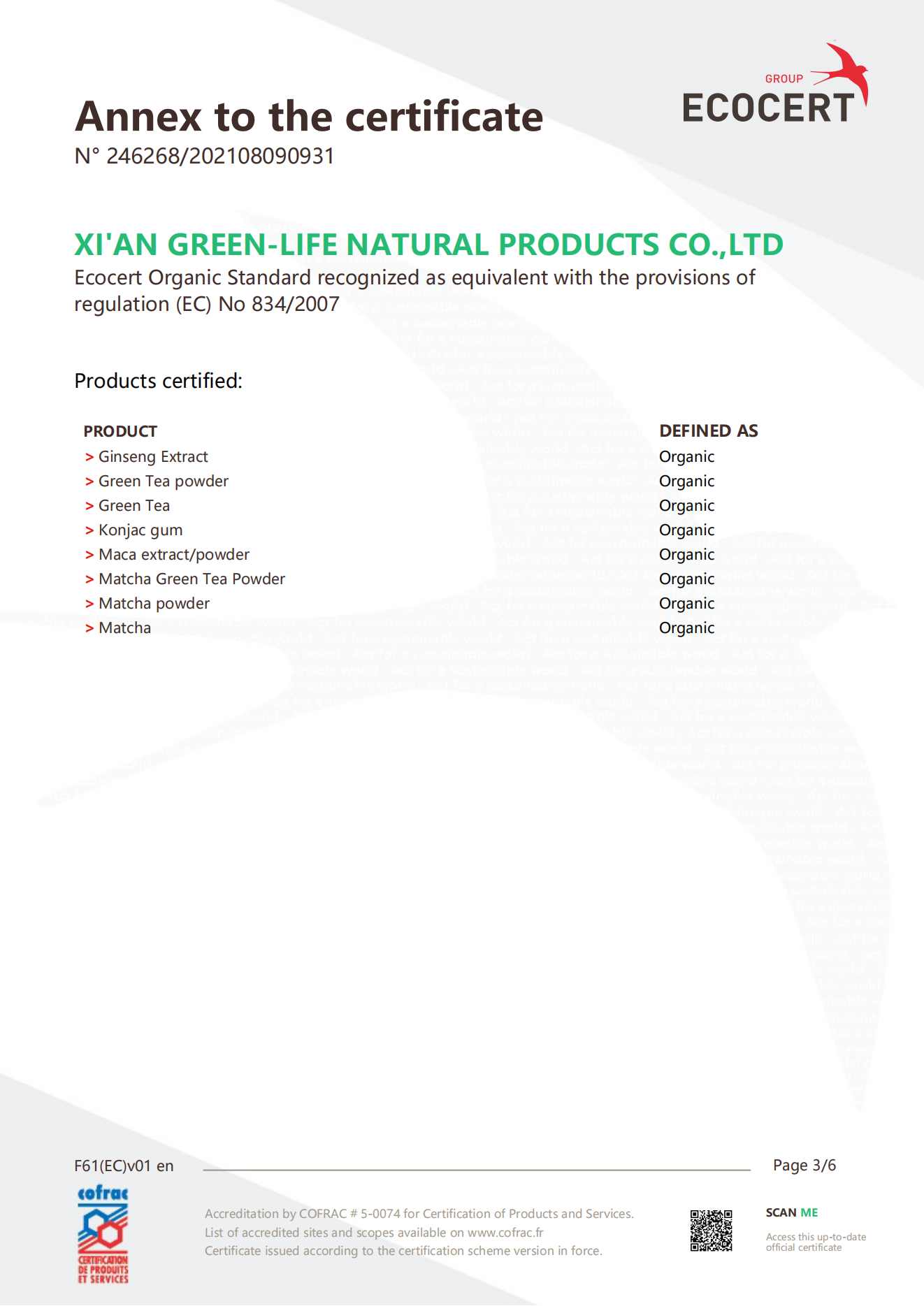 有机认证是有机农产品认证的简称。有机认证是一些国家和有关国际组织认可并大力推广的一种农产品认证形式,也是我国国家认证认可监督管理委员会统一管理的认证形式之一。推行有机产品认证的目的,是推动和加快有机产业的发展,保证有机产品生产和加工的质量,满足消费者对有机产品日益增长的需求,减少和防止农药、化肥等农用化学物质和农业废弃物对环境的污染,促进社会、经济和环境的持续发展。西安萃源生物现已通过有机认证的产品为10个品名,包括:有机芦荟提取物,有机黑蒜提取物,有机淫羊藿提取物,有机生姜提取物,有机人参提取物,有机绿咖啡豆提取物,有机玛卡提取物,有机玫瑰果提取物,有机大豆提取物,有机刺梨提取物。